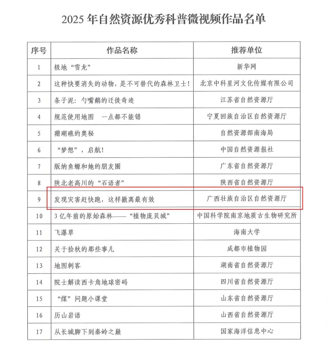 10月13日,自然资源部办公厅公布2025年自然资源科普讲解大赛、科普微视频大赛和优秀科普图书获奖名单。广西壮族自治区自然资源厅荣获优秀组织奖,短视频《发现灾害赶快跑,这样撤离最有效!》荣获自然资源优秀科普微视频作品,来自广西自然资源档案博物馆的余谭潇、姚利,来自广西自然资源生态修复中心的蔡金霖分别荣获自然资源科普讲解大赛三等奖和优秀奖、优秀奖,《“行星地球”丛书》5册(主要作者:陈宏毅、赵东军、张佳莉、朱佳玲、王莹)入选自然资源优秀科普图推荐名单。