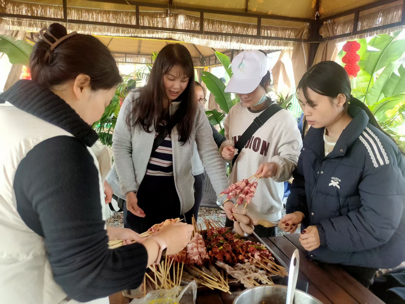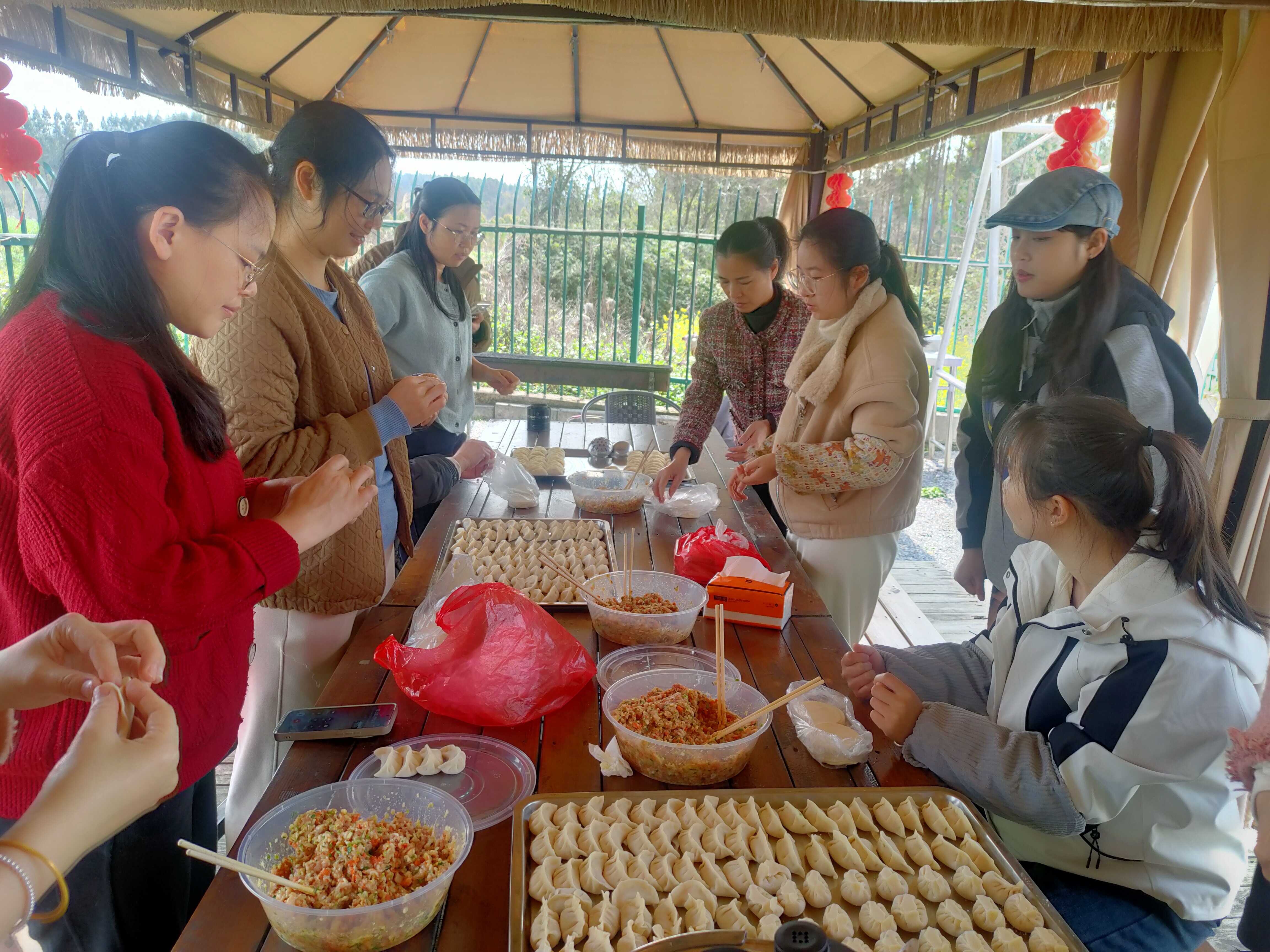 七彩虎头村坐落于碧溪湖畔,69 栋色彩斑斓的民居依山而建,瑶族文化元素与 3D 立体彩绘相映成趣,湖水潺潺、风车摇曳,构成了一幅诗意盎然的春日图景。活动现场,女职工们卸下工作的疲惫,化身 “巧手厨娘”,指尖翻飞间,一个个形态各异的饺子陆续成型,饱满的馅料承载着团圆的喜悦;烧烤架旁,炭火滋滋作响,肉串、蔬菜在火焰中翻滚,香气四溢,大家轮流掌勺、分享美食,欢声笑语回荡在村落间。期间,局领导代表单位为每位女职工送上了精心准备的鲜花,娇艳的花束与女职工们的笑容相映,传递着最真挚的节日祝福,让大家在温馨氛围中感受到组织的关怀与温暖。